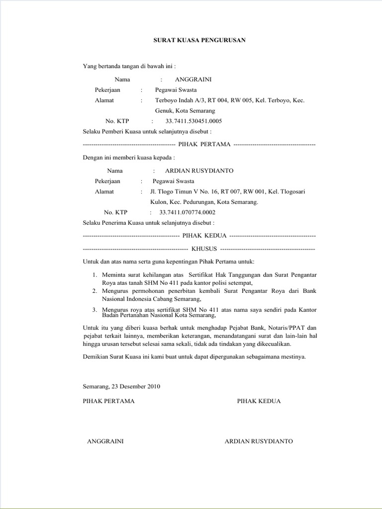 Tanah hpt ini tidak memiliki sertifikat maupun surat keterangan tanah (skt), makanya surat kuasa menjual tanah ini dibuat sesederhana mungkin. Download contoh surat kuasa pengurusan sertifikat tanah doc download format surat lain: Surat kuasa tanah yang bertanda tangan dibawah ini saya sebagai pihak 1 : Contoh surat kuasa pengambilan bpkb mobil.